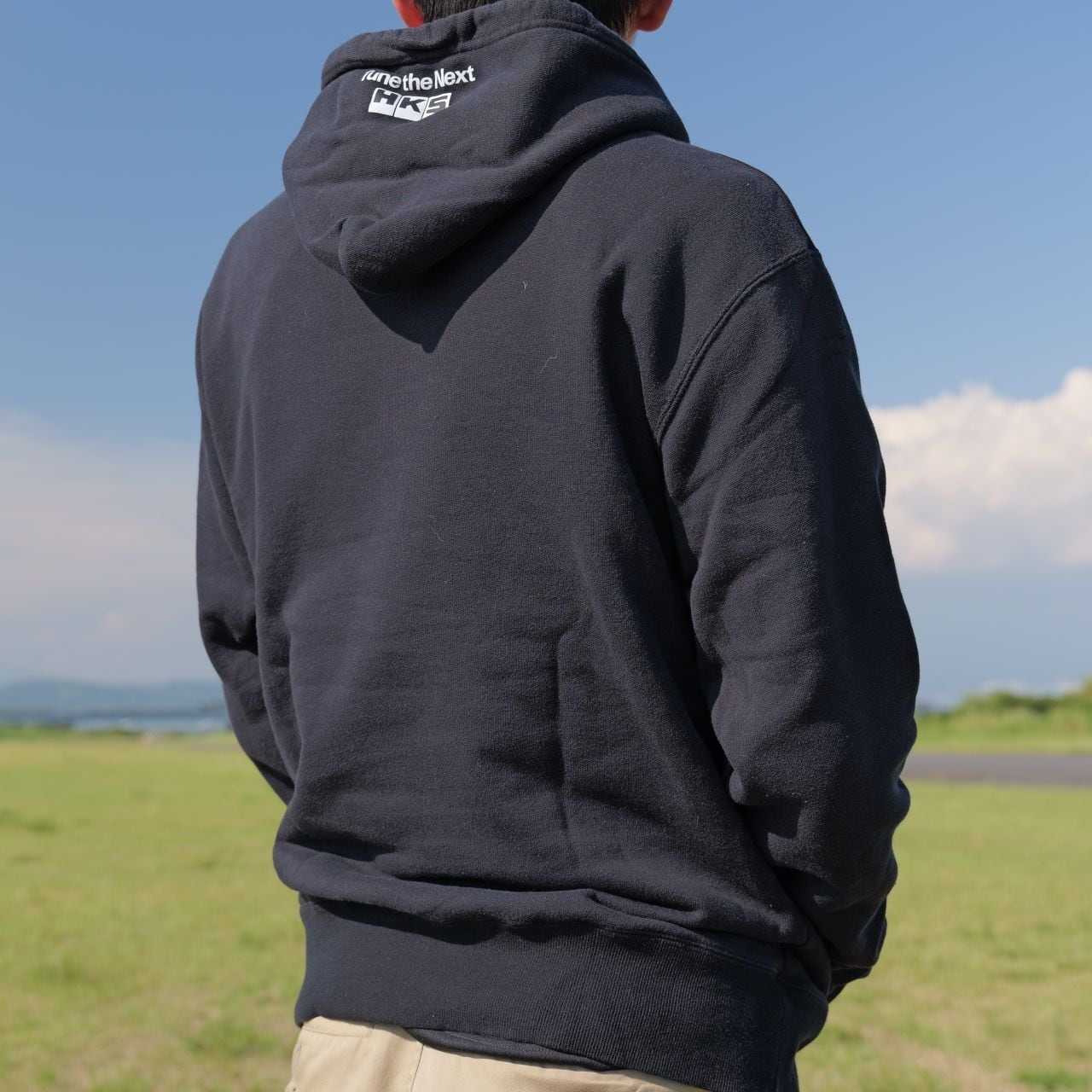 フードにはHKSのスローガン「Tune the Next」を配置。ロゴが映える、引き締まったイメージのブラック。