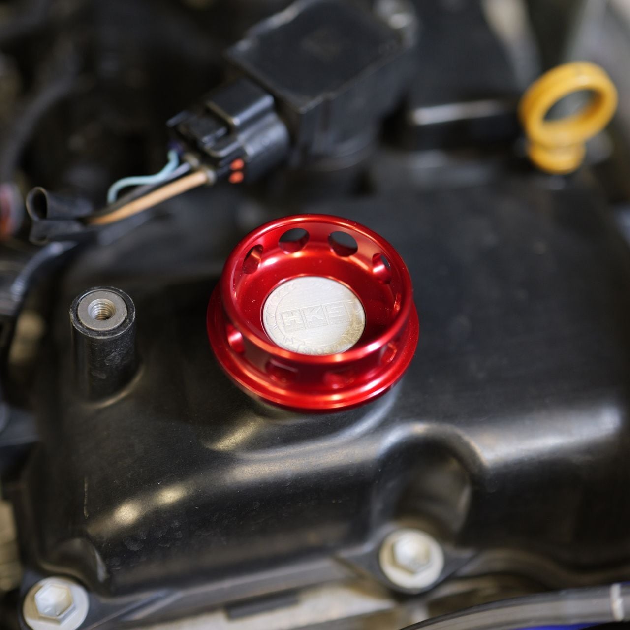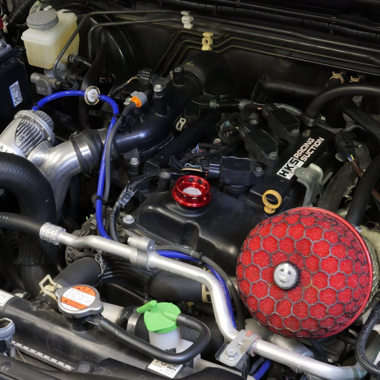 赤アルマイトを施すことで、エンジンルームをさりげなく演出するワンポイントドレスアップパーツとなります。